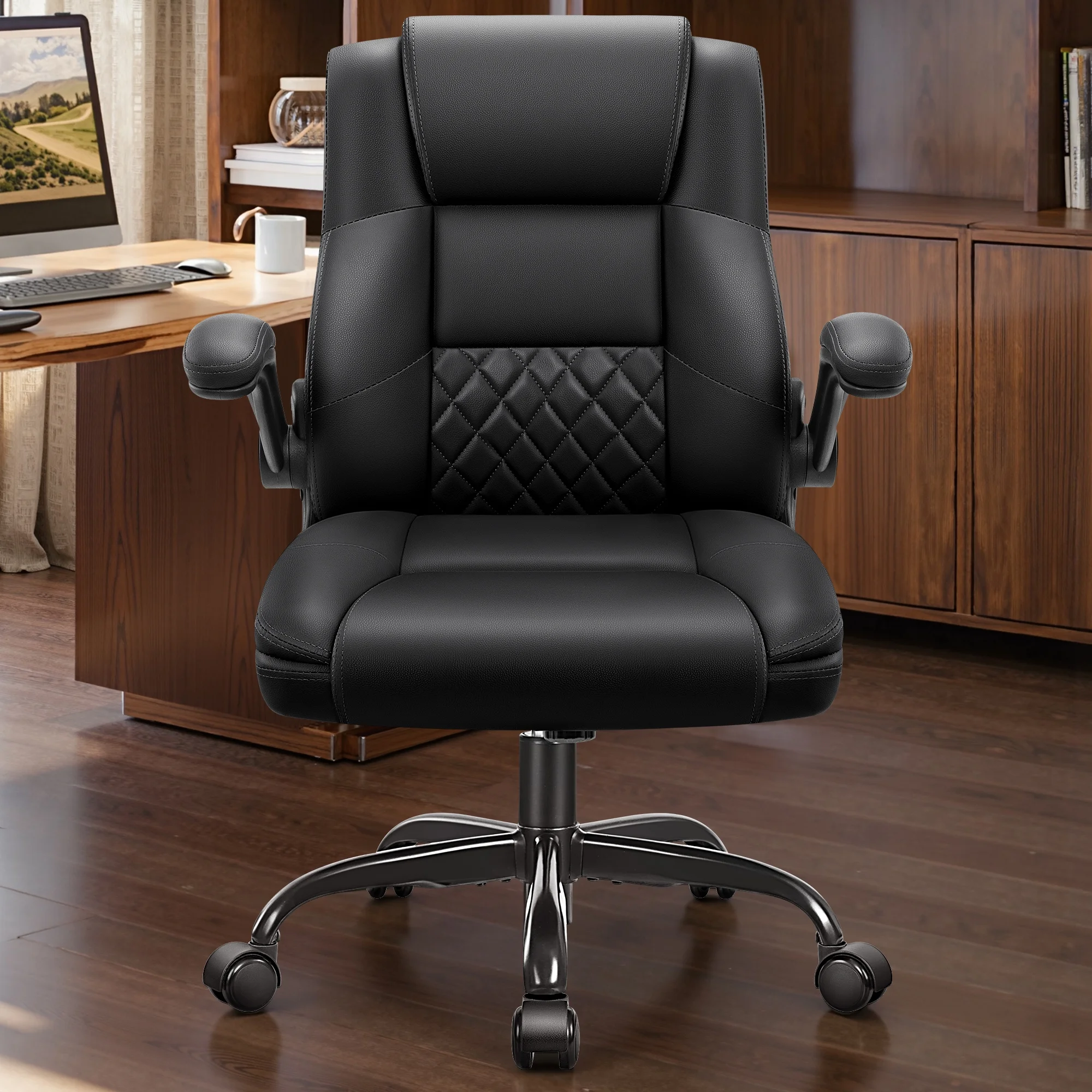 - Flexible Armrests: Convenient flip-up padded armrests allow for easy conversion between armrest and armless configurations, enabling space-saving storage under a desk when not in use.